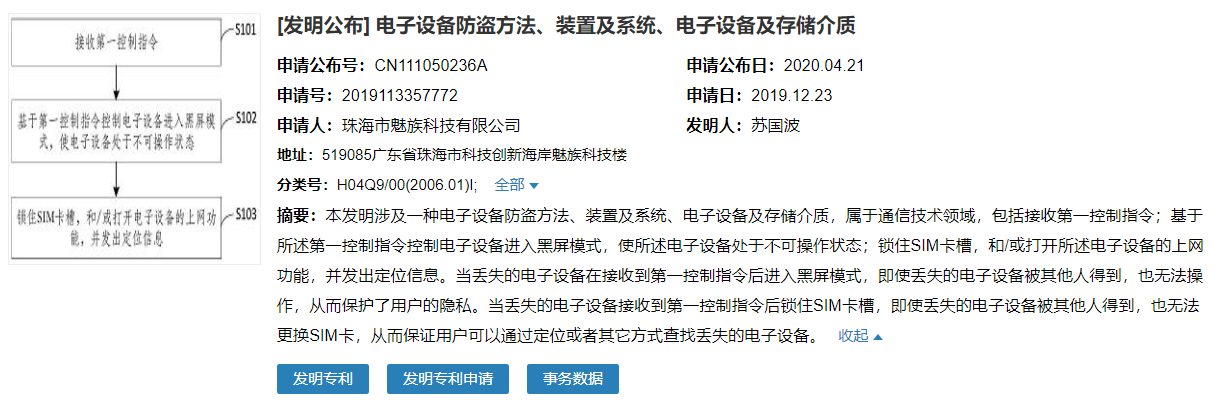 在手机防盗技术领域,魅族科技可谓是“未雨绸缪”。早在2022年,珠海市魅族科技有限公司的“电子设备防盗方法、装置及系统、电子设备及存储介质”专利获授权。