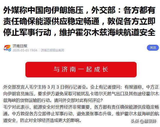 中方在正式表态中指出:“能源安全对世界经济至关重要,敦促有关各方立即停止军事行动,共同维护霍尔木兹海峡航道安全。”