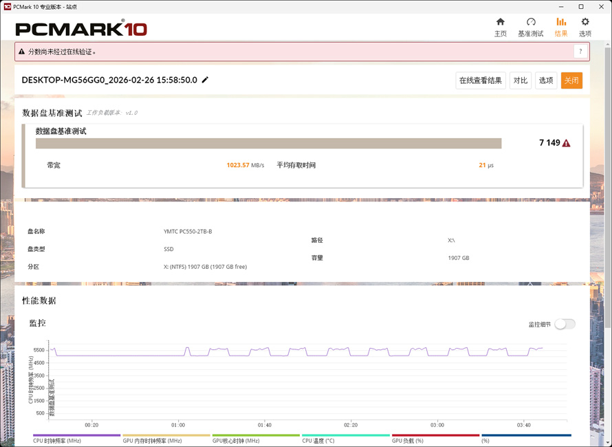 PCMARK10的数据盘基准测试,PC550 2TB得分为7149分,平均带宽1023.57 MB/s,平均存取时间为21 μs。