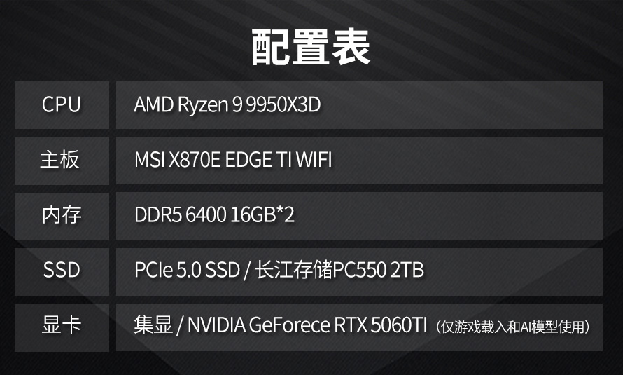 本次测试选用的是AMD平台,采用Ryzen 9 9950X3D处理器,搭配MSI X870E EDGE TI WIFI主板。将其安装在显卡插槽上方的CPU直连M.2接口,使用主板自带散热片。