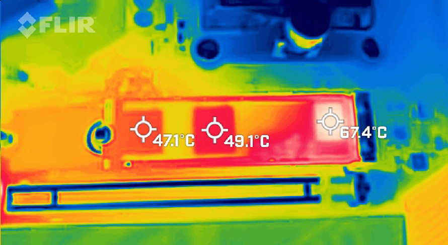 在全盘读取下,时间相比有散热片的情况下仅增加了8秒,可以说几乎不影响性能。HWINFO软件报告峰值温度仅为52℃;红外测温下主控最高为67.4℃,闪存最高为49.1℃。