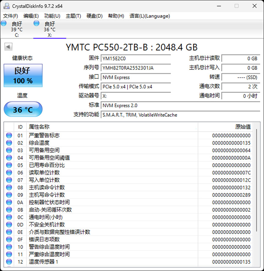 先使用CrystalDiskInfo软件看一下该盘的信息,可以看到这是一块读写均为0GB的新盘,可以最大程度地保证性能完全发挥。在使用主板自带被动散热片的情况下,待机温度仅为36℃。
