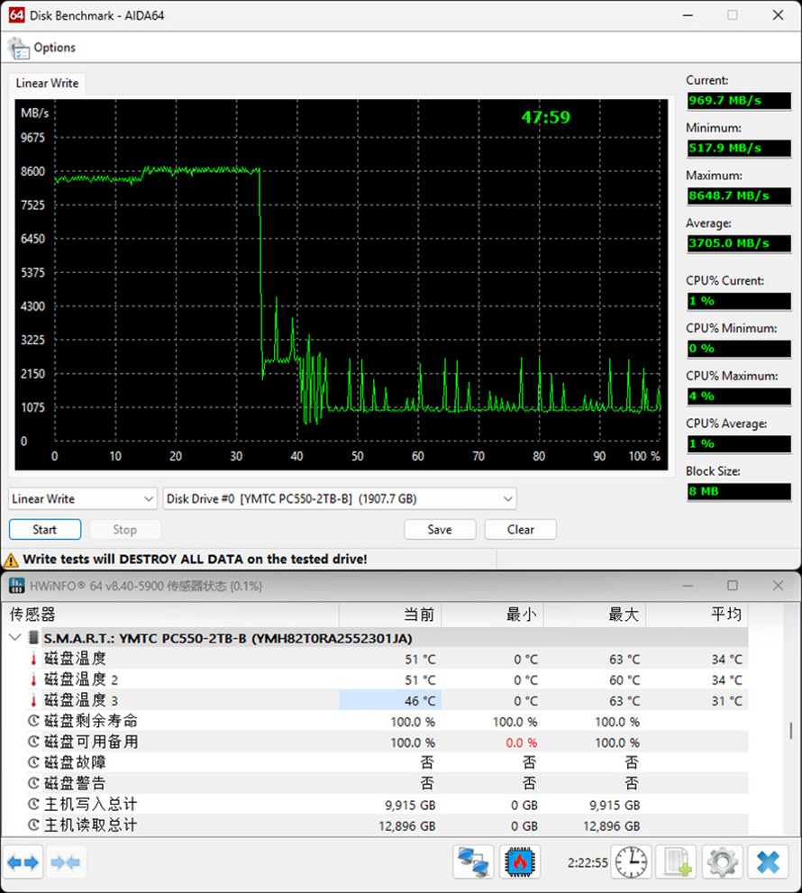 进行Linear Write全盘写入测试,PC550 2TB耗时46分08秒完成;搭配主板自带被动散热片下峰值温度也只有48℃。