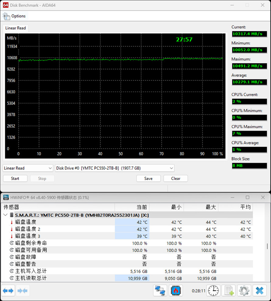 使用AIDA64进行Linear Read全盘读取测试,PC550 2TB耗时27分57秒完成;在搭配主板自带被动散热片下峰值温度仅为44℃。
