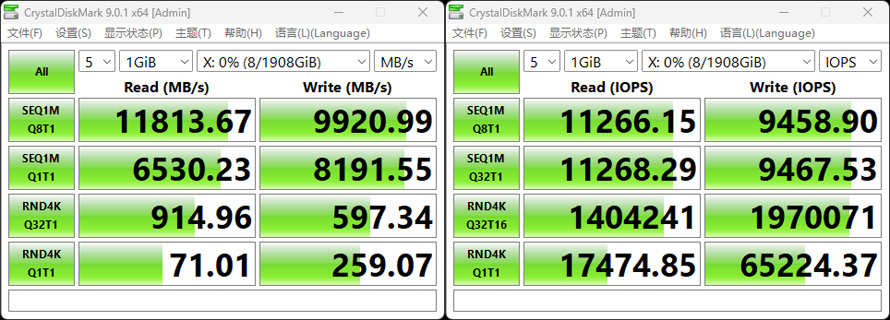 实测顺序读取速度为11814 MB/s,顺序写入速度为9921 MB/s,符合官方标称数值区间。随机读写性能方面,读取为1404K IOPS,写入为1970K IOPS,更是全面超越官方标称值。