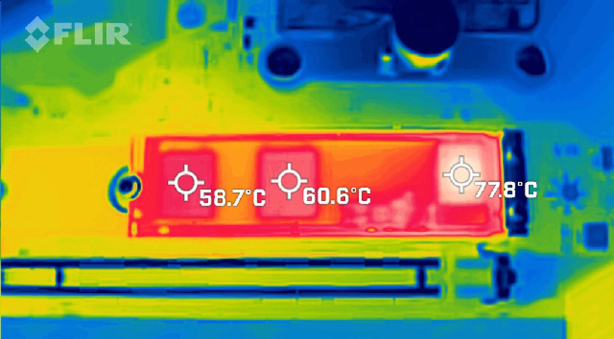 在全盘写入的情况下,时间也只增加了1分51秒,但整体曲线与使用散热片时基本没有变化,证明该盘完全可以脱离散热片使用。HWINFO软件报告峰值温度为63℃,温控表现依旧出色;红外测温下主控最高为77.8℃,闪存最高为60.6℃。