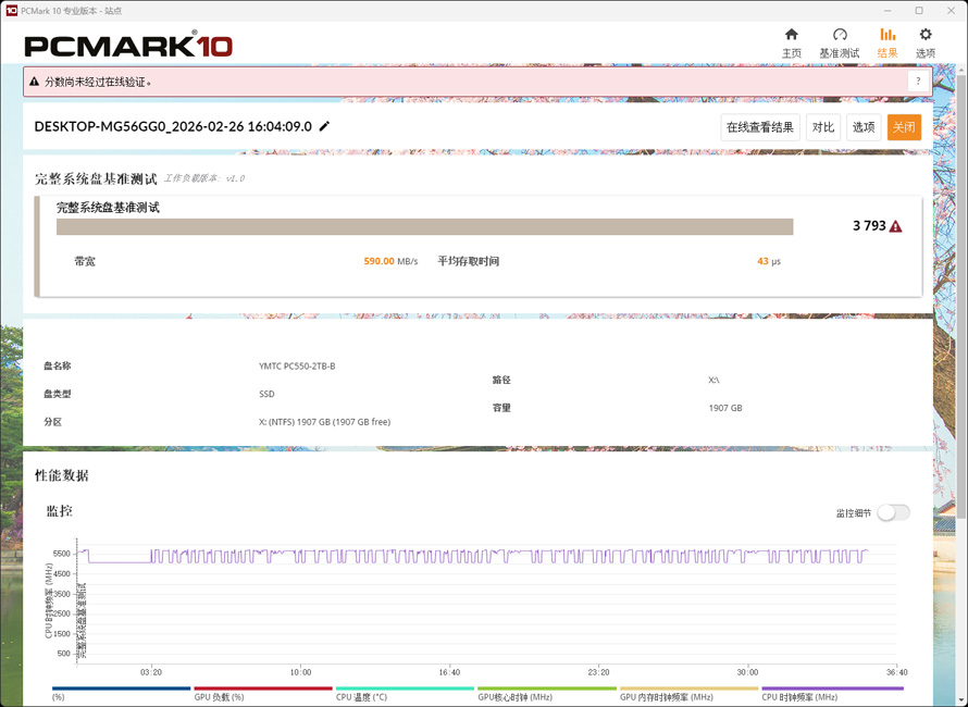 PCMARK10的完整系统盘基准测试,PC550 2TB得分为3793,平均带宽590.00 MB/s,平均存取时间为43 μs。