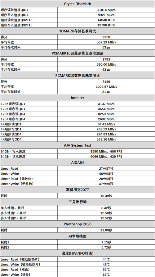 最值得关注的是其温度表现。即便在无散热片裸盘环境下,也未见明显高温,性能发挥基本不受影响,此类“冷静”的表现在目前的PCIe 5.0产品中较为少见。加上低于6W的满载功耗,使其对笔记本用户和紧凑型主机格外友好。