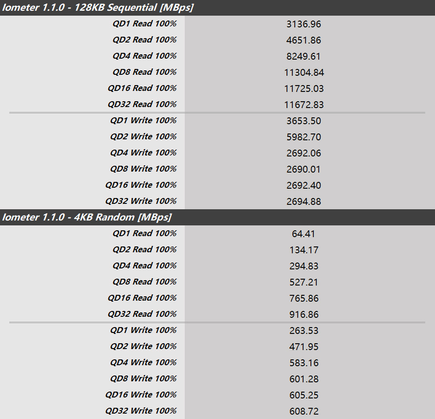 Iometer测试,主要来看一下PC550 2TB,在128K顺序读写和4K随机读写下,QD1和QD4队列的性能表现,来展现贴近日常环境下的I/O理论性能。