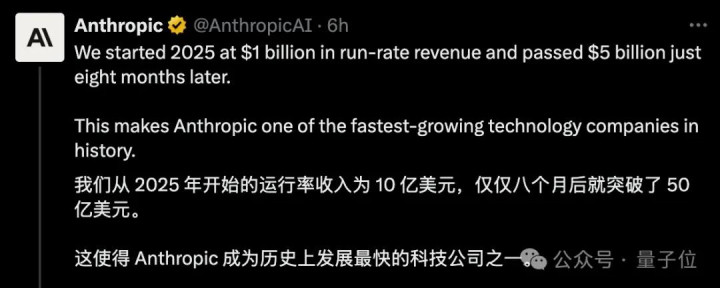 融资之外,Anthropic的业务造血能力也被进一步披露。短短半年时间,公司营收从10亿美元年化,一跃突破50亿美元。其中最核心的AI编程业务Claude Code年收入更是突破5亿美元。
