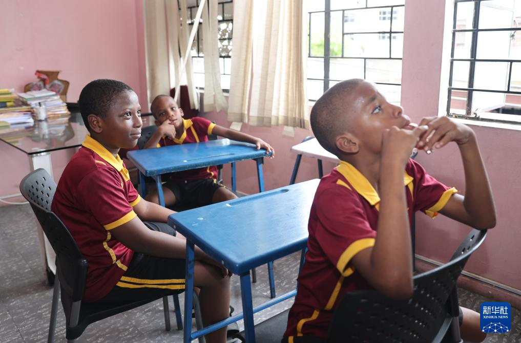 9月4日,在牙买加首都金斯敦艾特特殊教育小学,学生学习中文。新华社记者 李梦馨 摄
